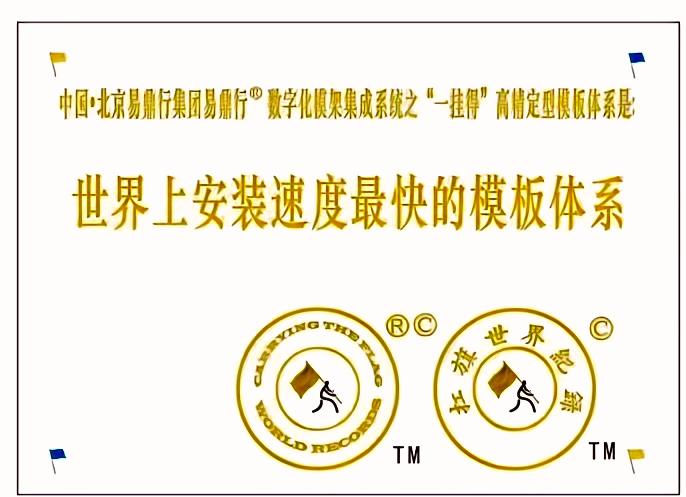 世界紀錄保持者: 中國•北京易鼎行集團易鼎行®數(shù)字化模架集成系統(tǒng)之“一掛得”高精定型模板體系。